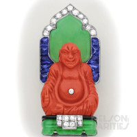 Coral, Fine Jade, Buff-Cut Sapphire, Diamond, Enamel and Platinum Buddha Brooch